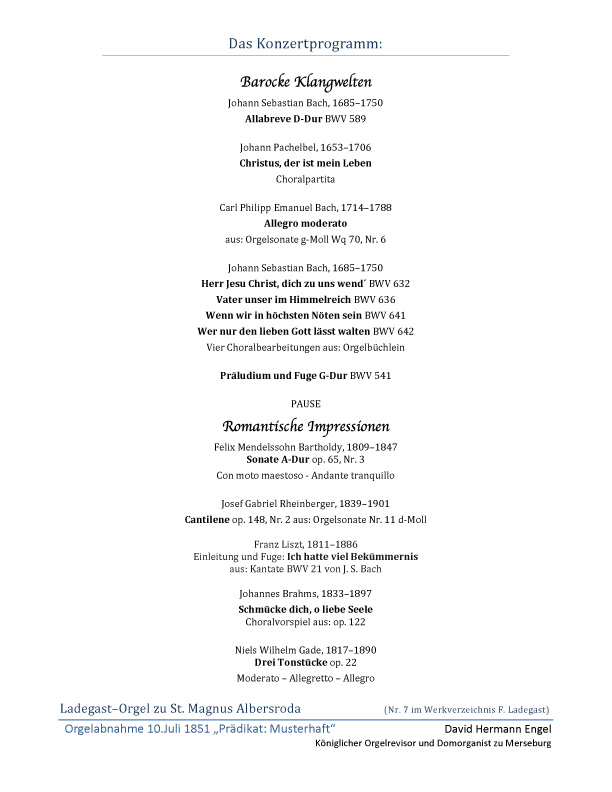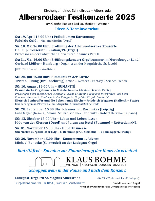 Orgelkonzert am 31. Mai und Programm der Festkonzerte 2025 in Albersroda