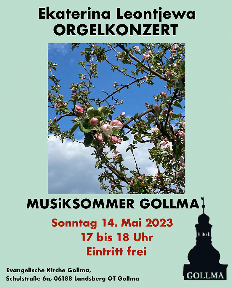 Am 7. Mai schickte uns Ulrike Weidt das Plakat zum Orgelkonzert am 14. Mai in der evangelischen Kirche Gollma mit Ekaterina Leontjewa (siehe Plakat unten).