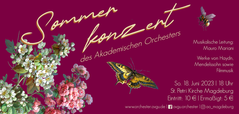 Passend zum kommenden Sommeranfang lädt das Akademische Orchester der Otto-von-Guericke-Universität Magdeburg am 18. Juni 2023 um 18 Uhr zu seinem Sommerkonzert in der St. Petri Kirche in Magdeburg ein. Unter der Leitung des Dirigenten Mauro Mariani werden die rund 40 Musikerinnen und Musiker die „Italienische“ Sinfonie von Felix Mendelssohn Bartholdy, die „Londoner“ Sinfonie von Joseph Haydn und eine Filmmusik aufführen.
